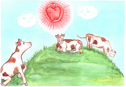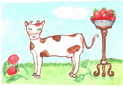 На полуничному полі народилася Корова. Перше, що вона побачила, була полуниця. Ягода була такою ароматною, що Корова тут же злизала її і заусміхалася.