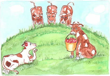 Корова слухала - і не вірила. Минав час, вона подорослішала і стала красивою Корівкою з довгою чорною косою. У неї з'явилися кавалери. Та вона давно вже зрозуміла, що полуничне поле далеко, а трава дійсно корисна.