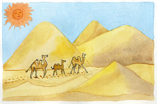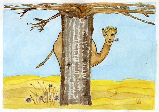 Так і живе Верблюд - колючки їсть, та по пагорбах своїм життя міряє. Коли в пустелі сезон дощів розпочався, вирішив верблюд шукати укриття. Йде по пустелі, з носа краплі злизує, дивиться по сторонах. Бачить - дерево. "Туди й піду", - думає. Підійшов до дерева, а його місце вже хтось взяв.