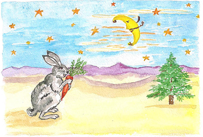 Тут раптом, звідки не візьмися, Зайчик з'явився. З гостей додому повертався, так доріжку і втратив. Тямущий Зайчик був. Дід у нього Льотчиком в лісі служив, маленького Зайчика всьому навчив: "Якщо раптом Лисицю зустрінеш - не біжи швидко, петляй багато. Лисиця поки твої сліди розбере, тебе і слід прохолов", "хочеш морквину, а в лісі немає її? Так ти піди на базар, купи насіння, навесні посади, влітку урожай буде". А про ніч дід казав: "Буває, зірки рано спати ляжуть, туманом сховаються. Місяць в гості до Ведмедя забреде. Так ти не марнуй часу. Знайди найвище дерево, заберись на маківку, і клич Ведмедя. Він розсердитися, до дерева підійде. Тебе не дістане, а Місяць випустить. Хотів Зайчик почати дідів рада виконувати, глянь на небо - а зірки не сплять.