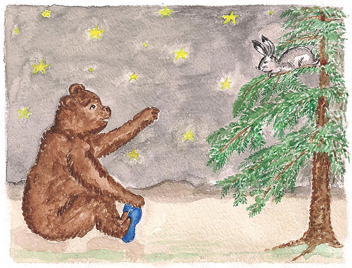 Старалися зірки допомогти, але далеко вони від землі, слабо світять. Ну, тепер високе дерево треба шукати. Знайшов Зайчик високу ялину. Стриб-скок - і нагорі. Почав Зайчик Ведмедя кликати. Та не чує Ведмідь - спить. Тоді Вітер до Зайцю допомагати прилетів. Разом - докричалися, розбудили. Мишко встав незадоволений. Місяць стрепенувся. Мишко підійшов до ялини, та не бачити зайця, темно.
