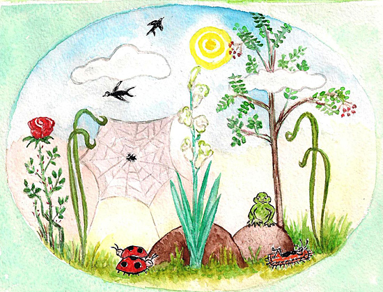 Сонячні промені освітили траву і мурашки витягли килимки для засмаги. Камені нагрілися, і, рум'яні, як після лазні, стояли під пишним глодом. На один з каменів стрибнула жаба, і тут же відскочила остуджувати своє тіло в сирій тіні.