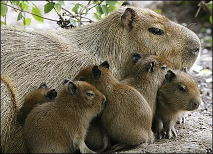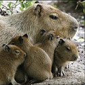 Найбільший у світі гризун. Її маса досягає 50 кілограмів. Живе біля самого берега і при найменшій небезпеці кидається у воду. На суші головні вороги капібар - ягуари, але і воді для них криється небезпека - зустріч з притаившимся алігатором.