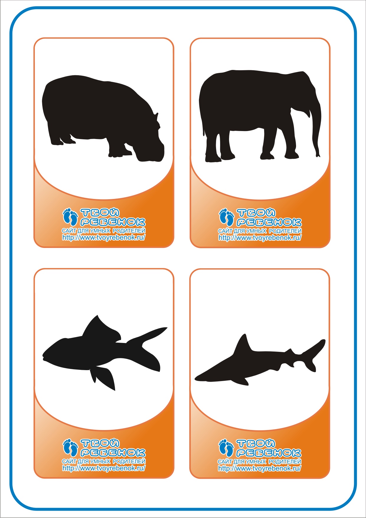 Гра для дітей "Відгадай тварину": представлені зображення таких тварин: бегемот, слон, риба, акула. Ви можете безкоштовно завантажити зображення, роздрукувати його на принтері.