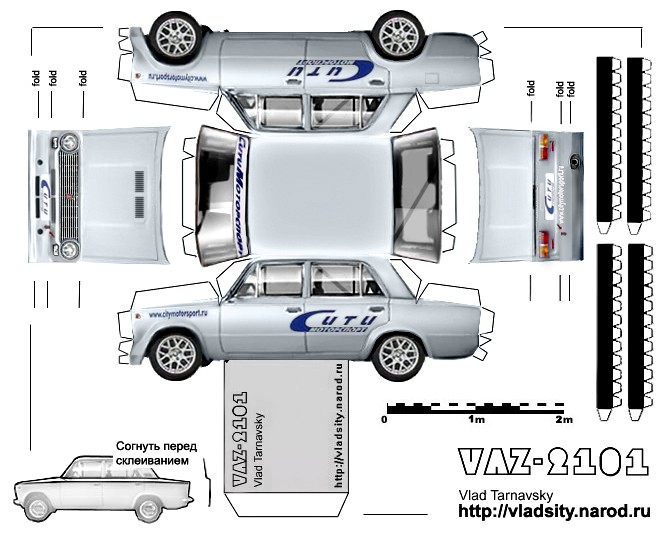 ВАЗ 2101 з паперу. Представлена детальна схема збирання. Роздрукуйте на принтері, зігніть, а потім склейте. Модель авто виконана в масштабі 1:32 і дуже реалістична.
