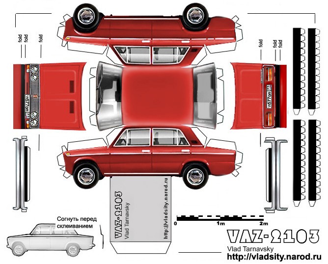 Популярна модель ВАЗ 2103 з паперу. Роздрукуйте схему на кольоровому або чорно-білому принтері, зігніть і склейте. Модель виконана в масштабі 1:32 і дуже реалістична.