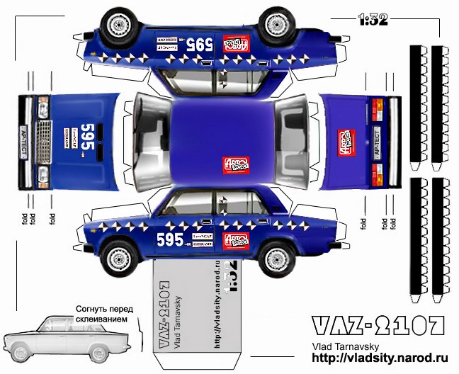 Популярна російська модель ВАЗ 2107 з паперу. Роздрукуйте схему на кольоровому або чорно-білому принтері, зігніть і склейте. Модель виконана в масштабі 1:32 і дуже реалістична.