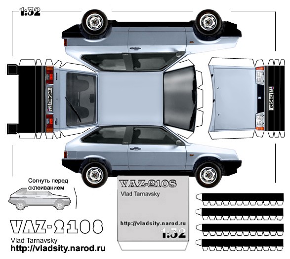 ВАЗ 2108 з паперу. Представлена детальна схема збирання. Роздрукуйте на принтері, зігніть і склейте. Модель виконана в масштабі 1:32 і дуже реалістична.