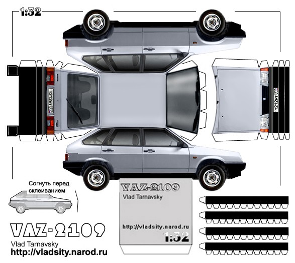 ВАЗ 2109 з паперу. Представлена детальна схема збирання. Роздрукуйте на принтері, зігніть і склейте. Модель виконана в масштабі 1:32 і дуже реалістична.